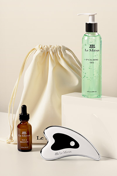 Targeted gua sha professional kit hydrates, soothes, and sculpts facial contours while reducing fine lines and improving skin tone and texture. Includes growth factor serum, gua sha cream, soothing gel, mineral spray, and Gua Sha ThermaLift sculpting tool.